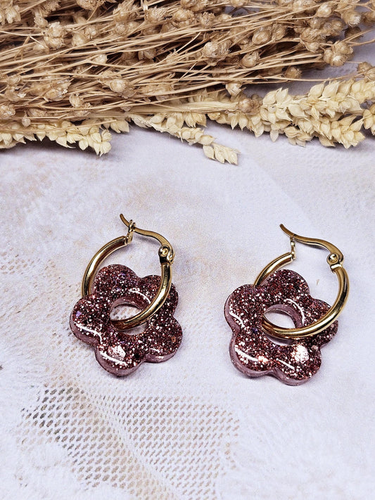 Boucles oreilles ZELIE interchangeables fleur PAMPILLE / créole femme en Acier Inoxydable - vieux rose paillette