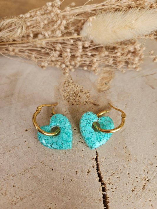 Boucles oreilles AMBRE interchangeables cœur PAMPILLE / créole femme en Acier Inoxydable - BLEU PAILLETE