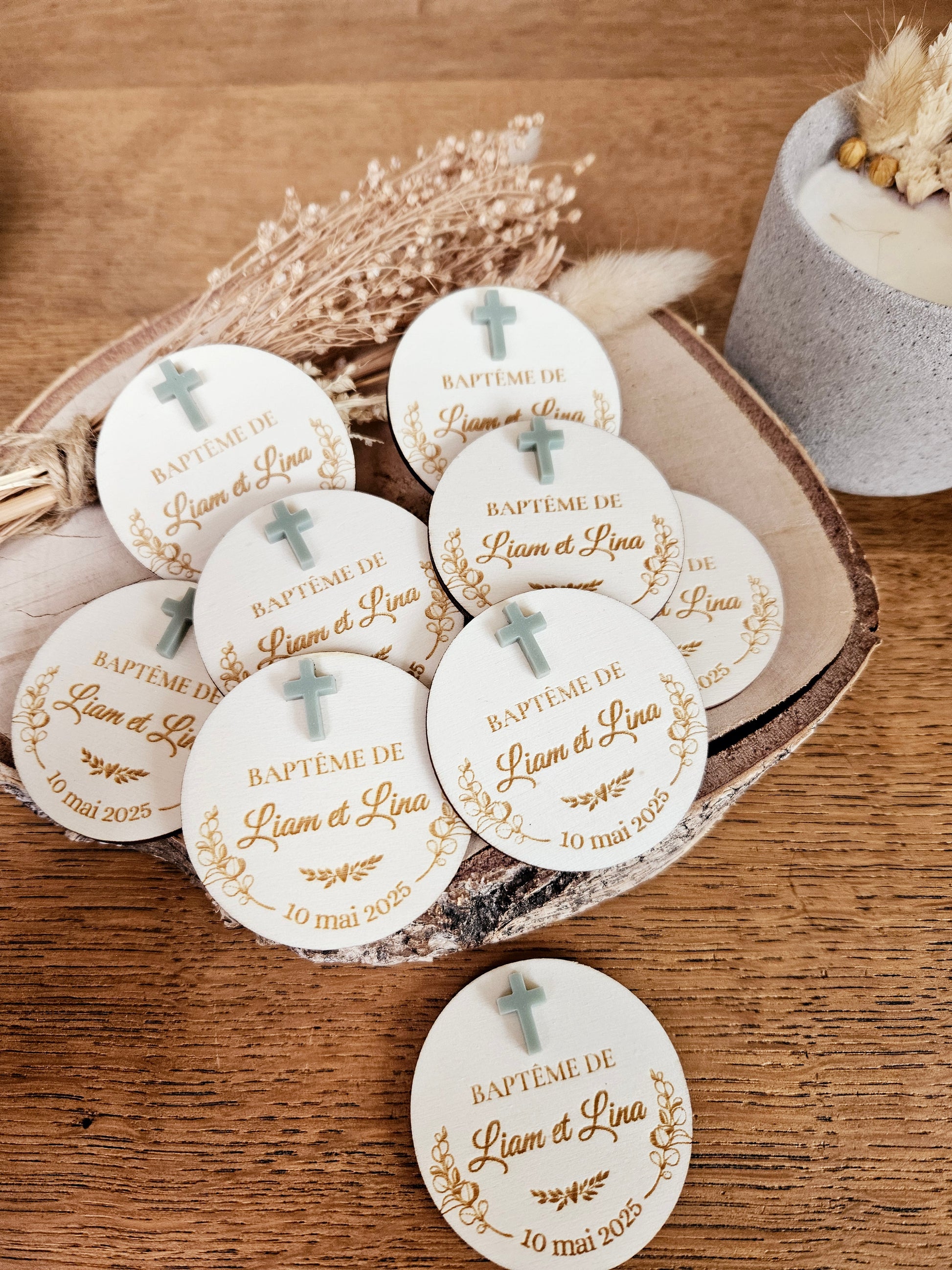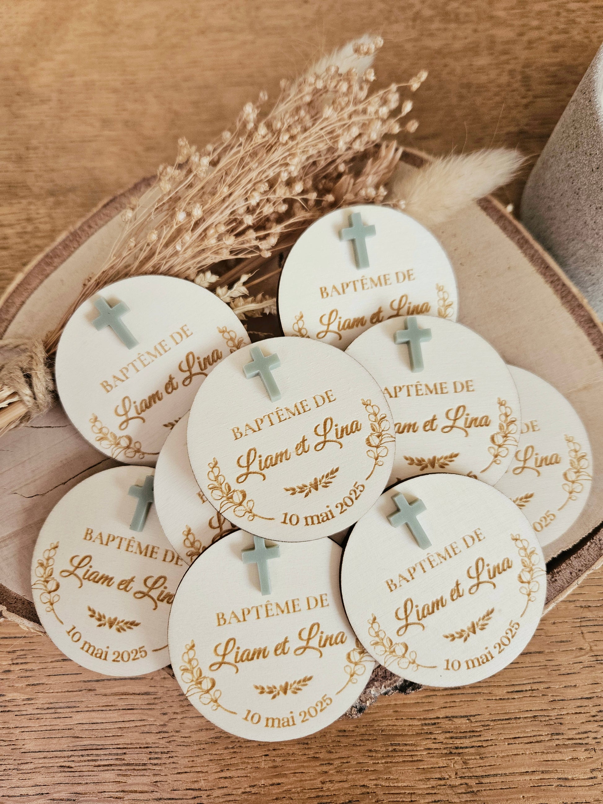 Magnet bois religieux eucalyptus / croix / baptême communion mariage - cadeau invité