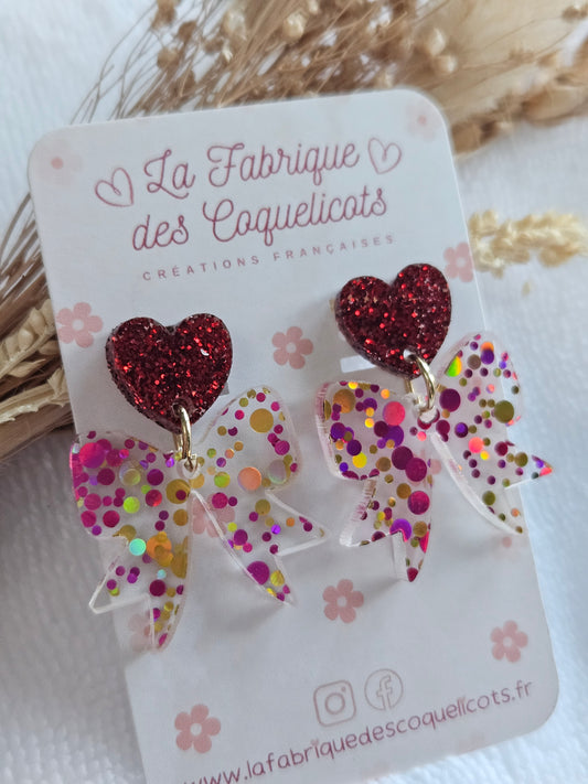 Boucles d'oreilles - Collection Noël "Let it Shine" - Cœur champagne et Nœud rouge paillettes