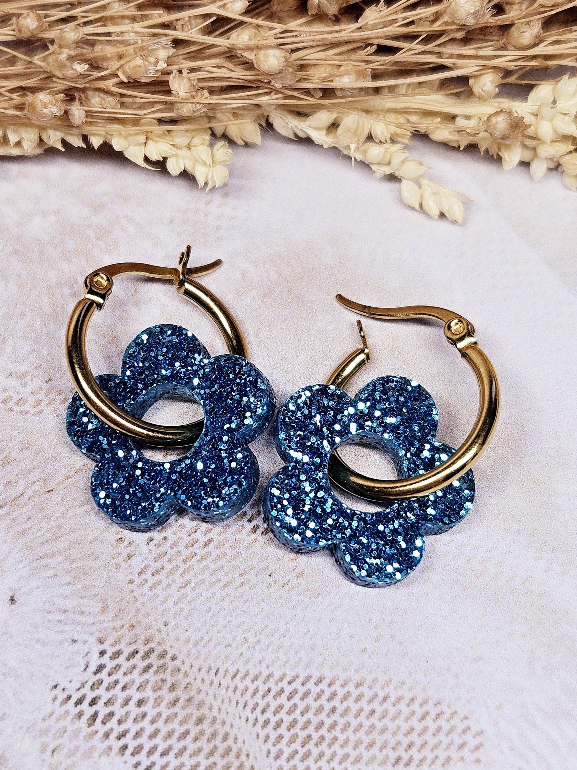Boucles oreilles ZELIE interchangeables fleur PAMPILLE / créole femme en Acier Inoxydable - bleu paillette