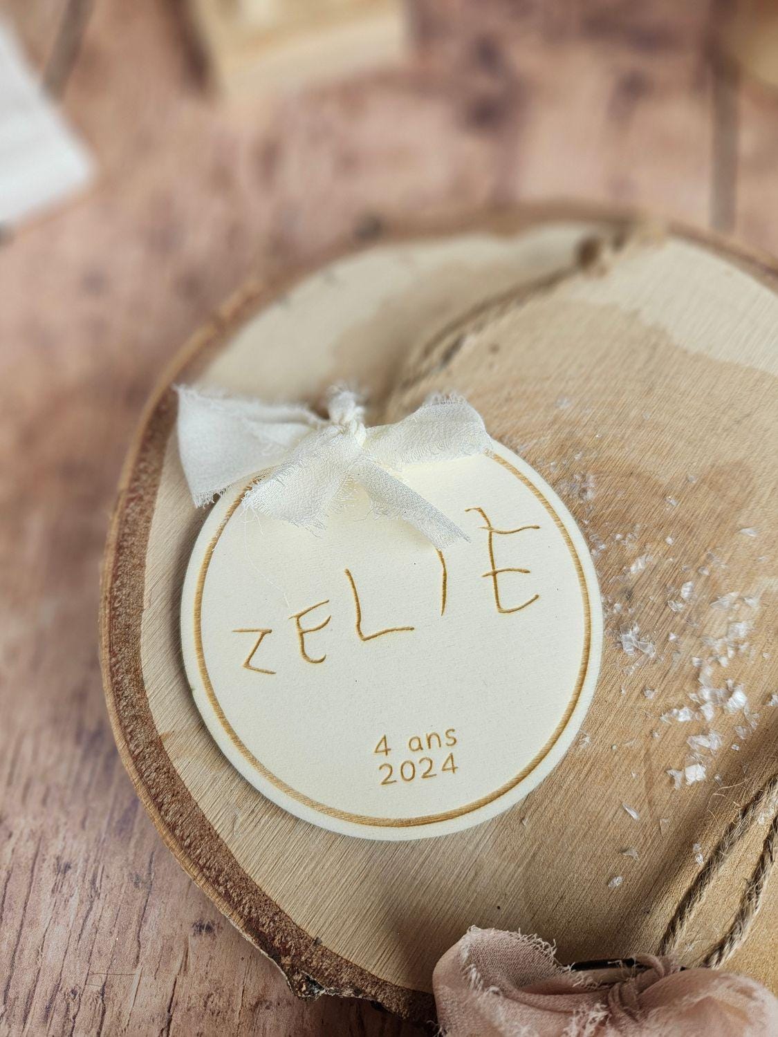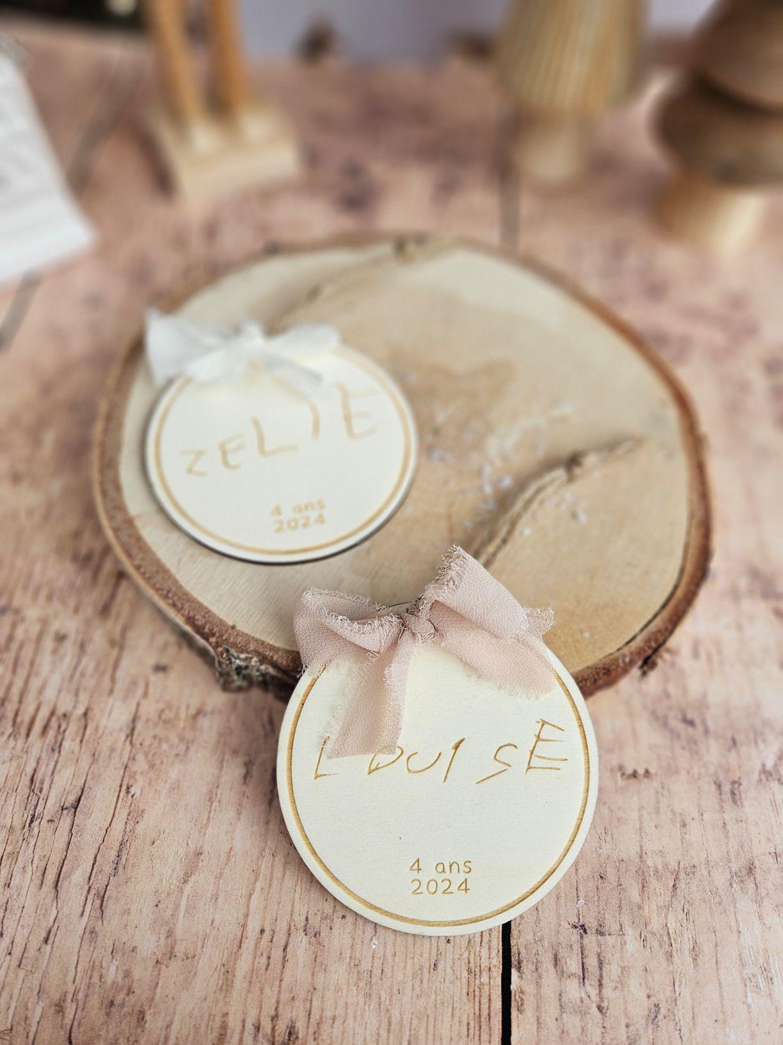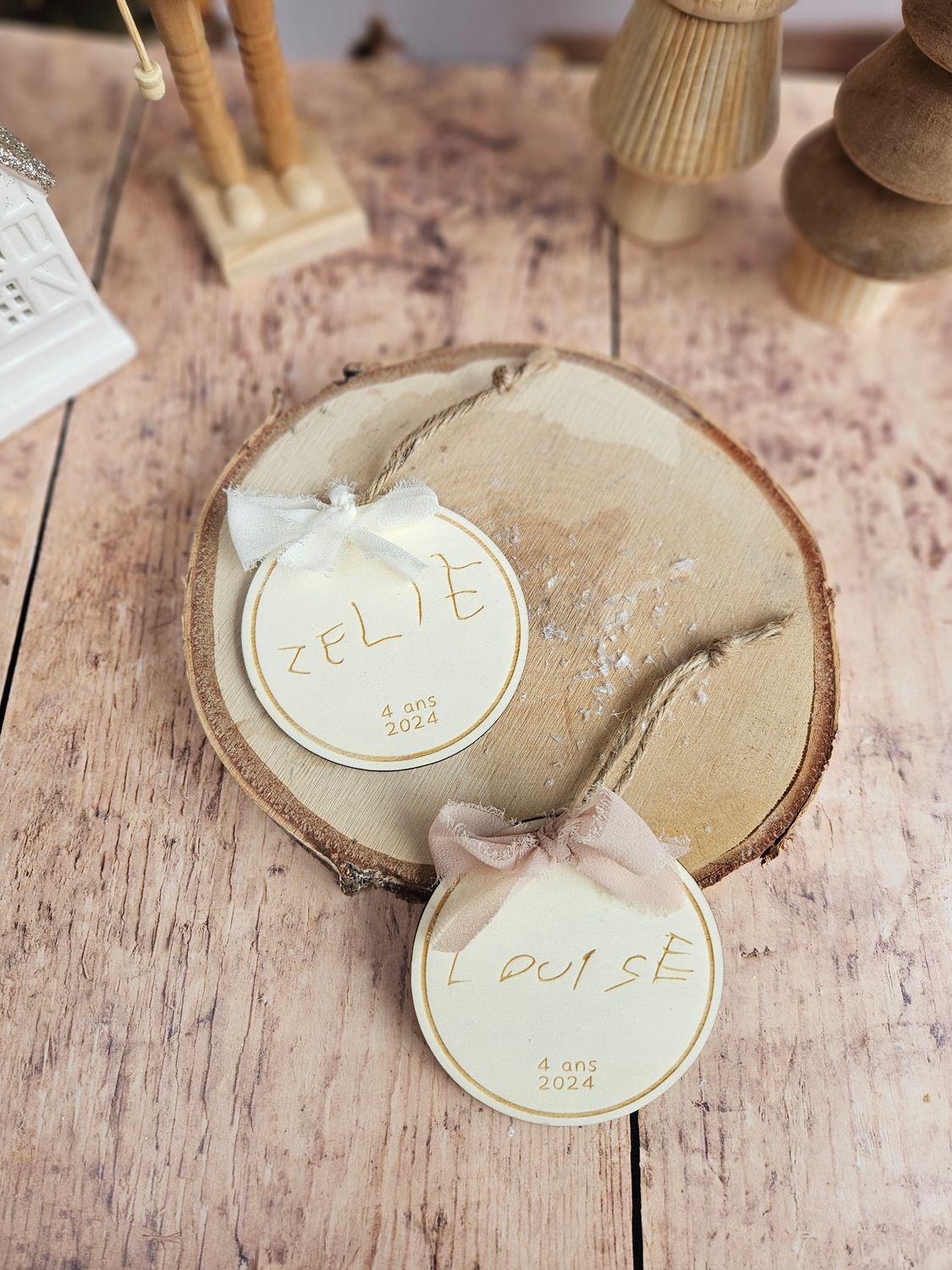 Laissez votre enfant écrire son prénom + un petit motif si vous voulez (cœur, étoile arc en ciel .. ) sur une feuille blanche , prenez en photo et nous les gravons en boule de noël !