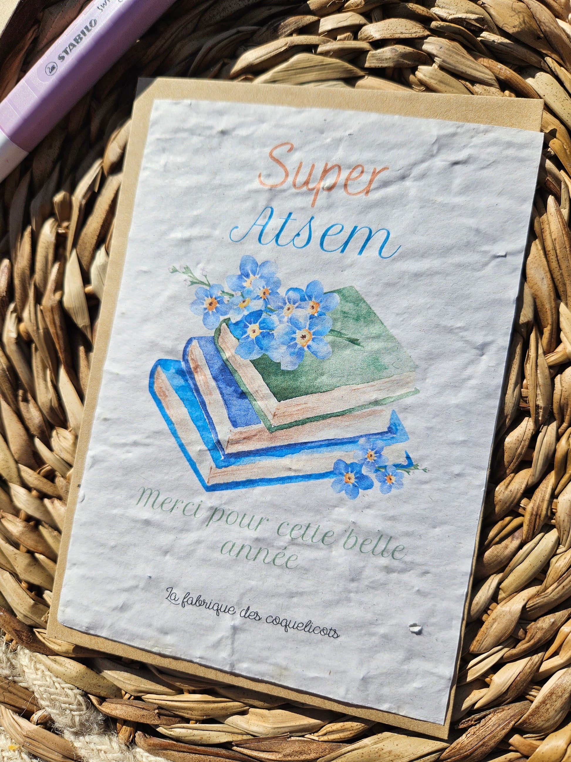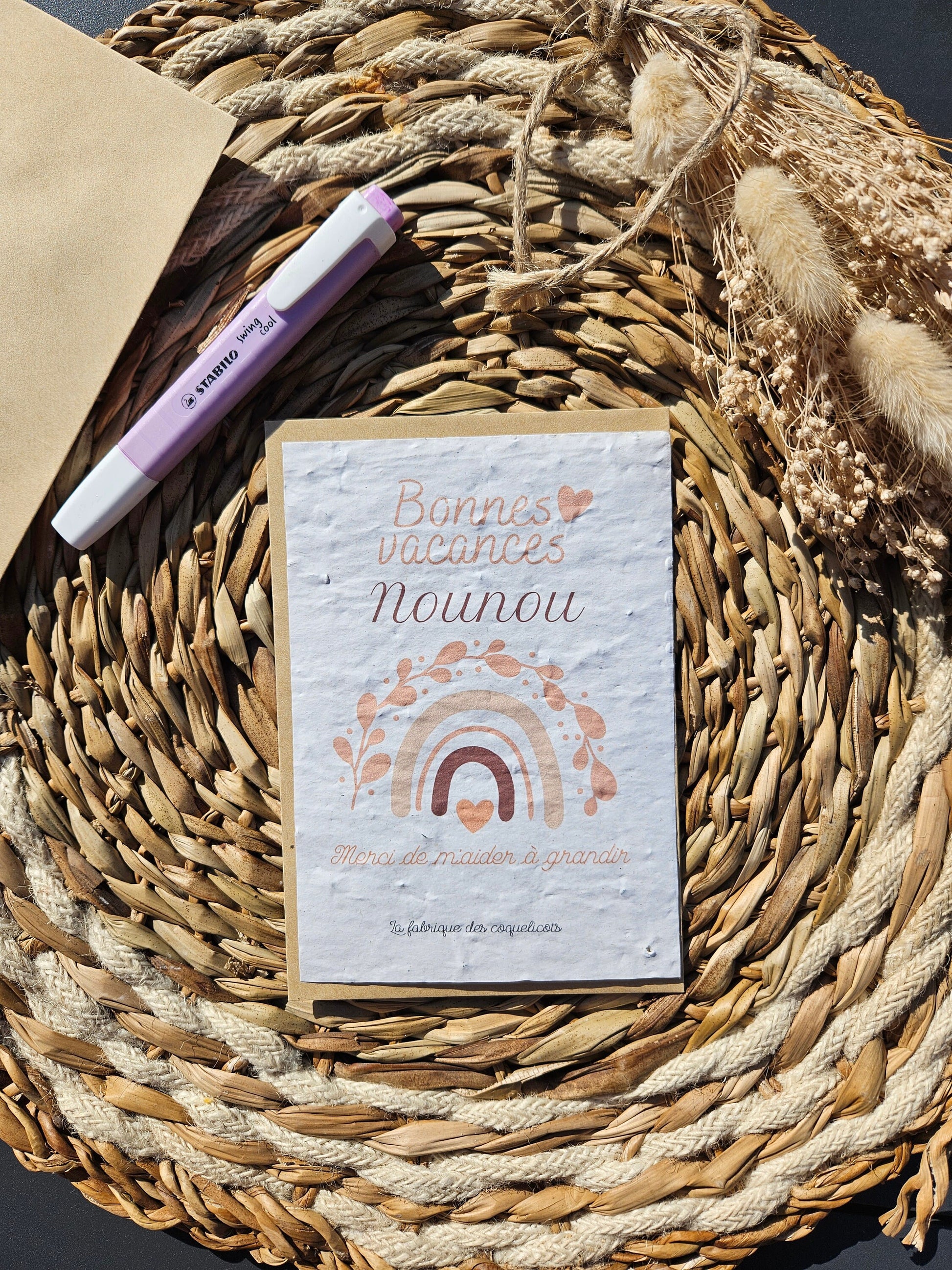 Créée et Imprimée sur du papier ensemencé de graines, il suffira de la mettre en terre, de l'arroser un peu quotidiennement et quelques jours plus tard pousseront de jolies fleurs. Une manière écologique et originale d'accompagner vos petits cadeaux.