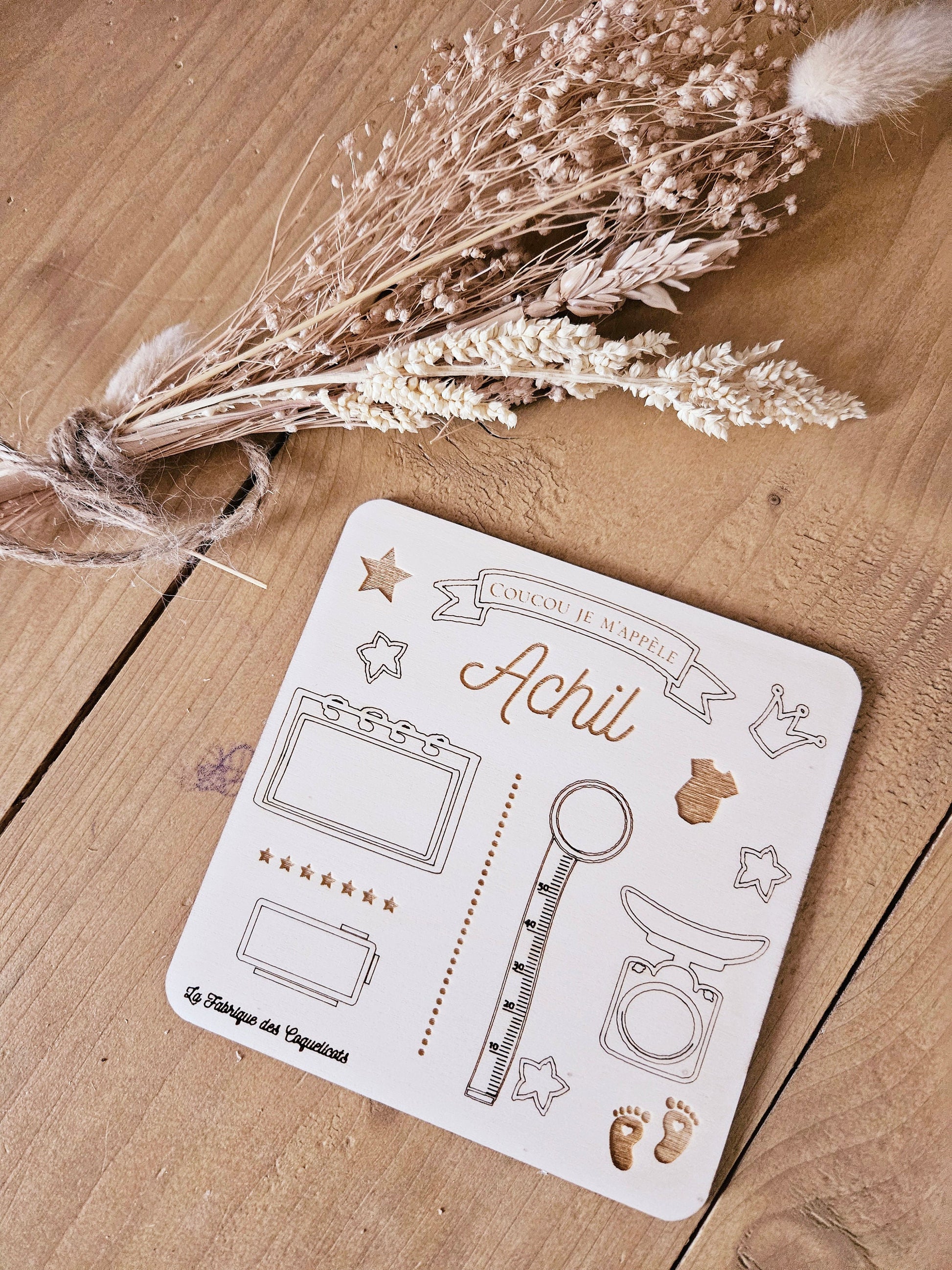 En 2 versions, avec les infos de naissance ou juste avec le prénom et la place pour y ajouter les infos de naissance au stylo vous même à l'arrivée de bébé (ne pas utiliser de feutre)