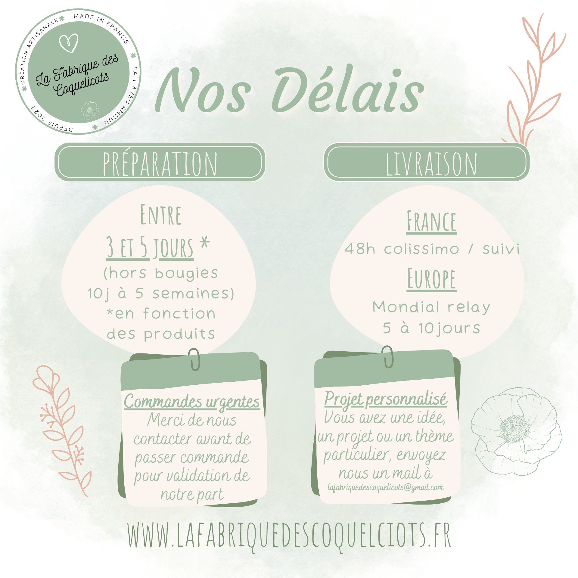 Pour tout projet personnalisé & unique, vous pouvez nous contacter à lafabriquedescoquelicots@gmail.com