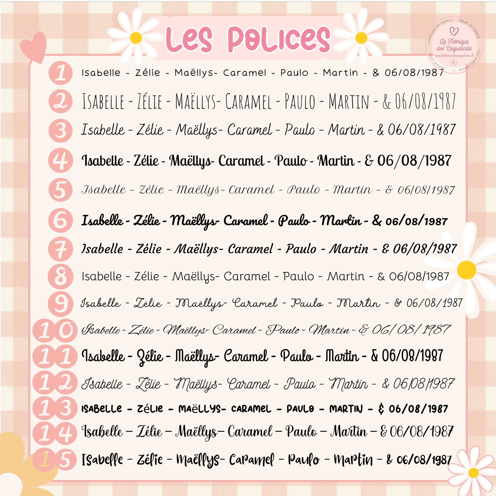 Pour les produits personnalisés et afin qu'il soient fidèles à vos attentes, merci de vérifier attentivement l’orthographe et l’exactitude des informations saisies (prénom, options, date, etc.) avant de valider votre commande. Une fois la commande passée, nous ne pourrons plus modifier ces détails.